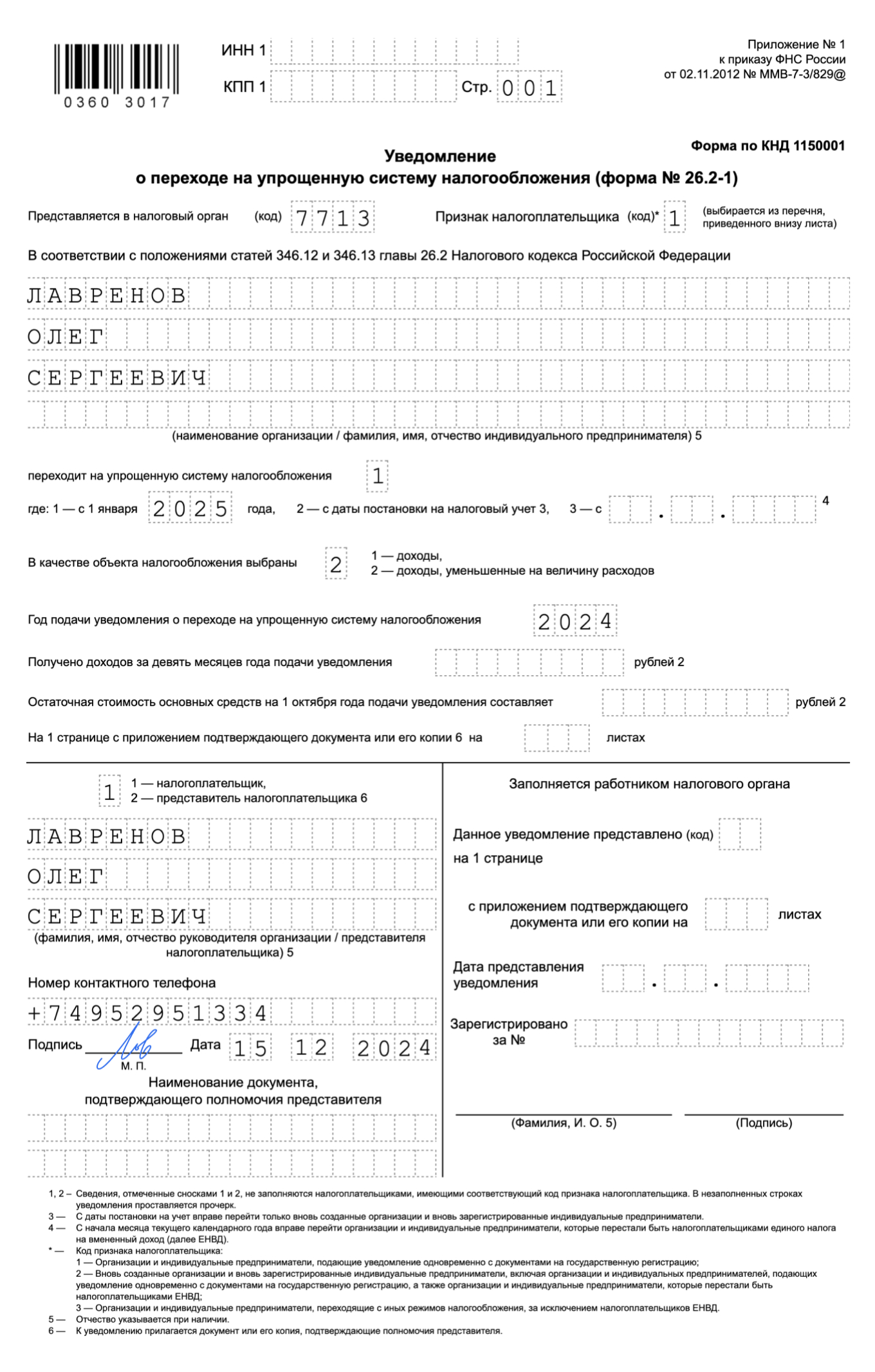 Чтобы перейти на упрощенную систему налогообложения, нужно подать уведомление в налоговую до 31 декабря. Составили шаблон уведомления — можете скачать и заполнить по образцу.