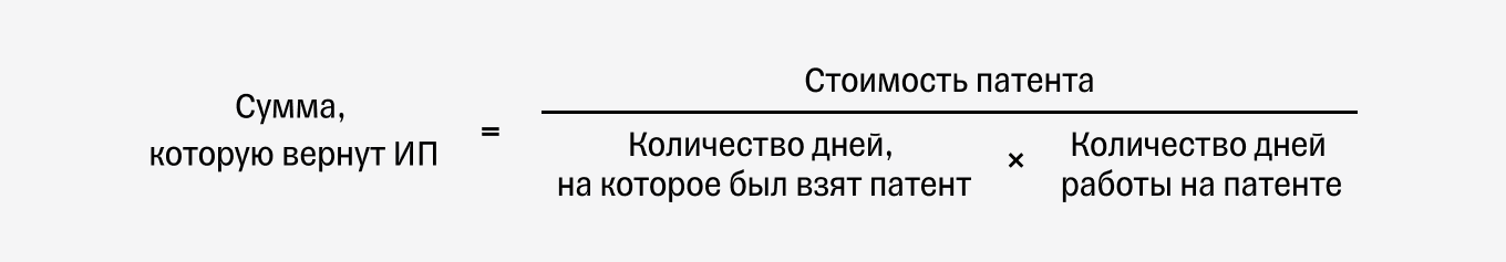 Если предприниматель прекратил работу на патенте раньше, чем истек срок его действия, он может обратиться в налоговую, чтобы ему пересчитали стоимость патента. Налоговая учтет только дни, которые предприниматель отработал на патенте, а за остальные вернет деньги: