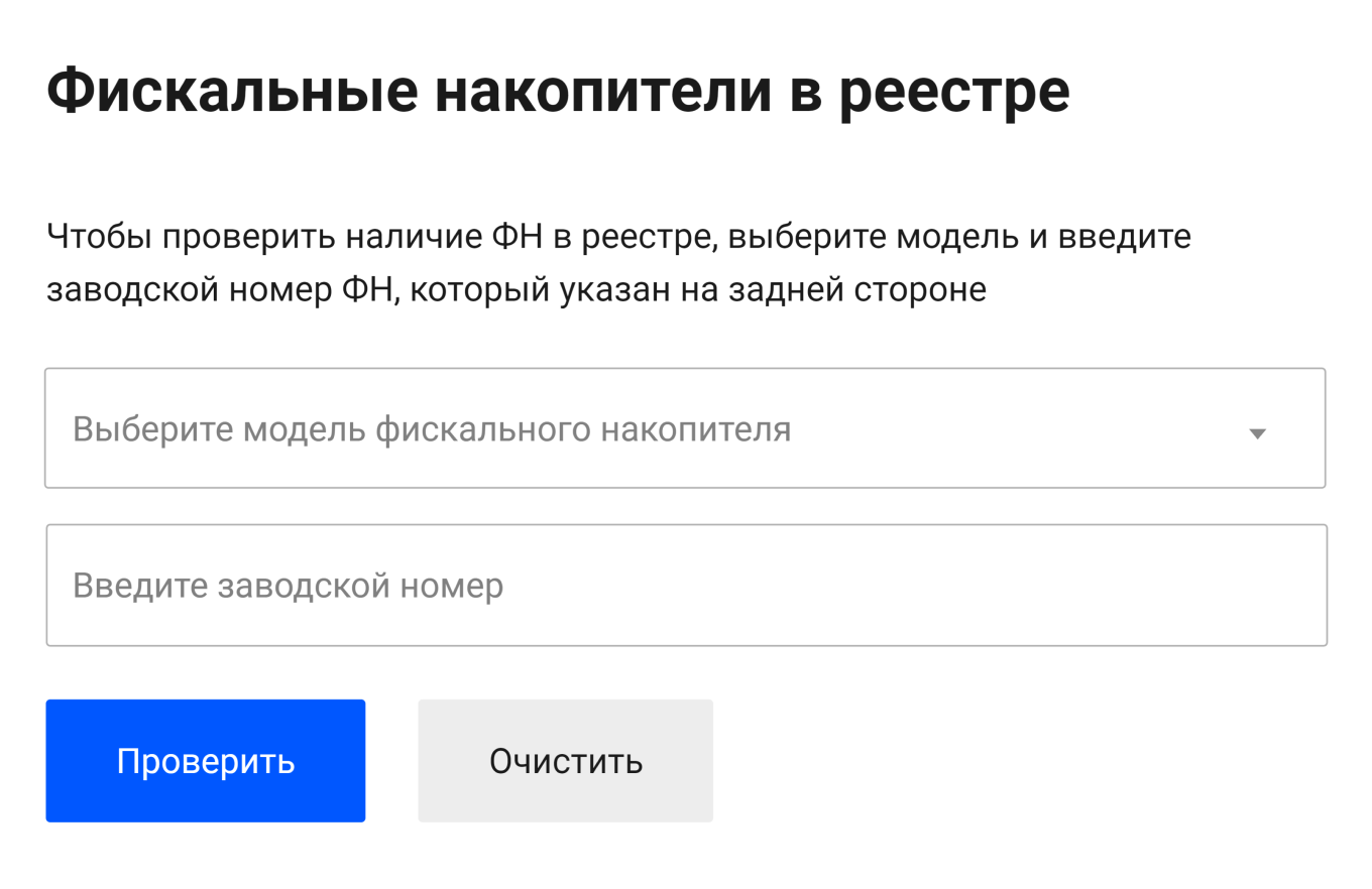 Выбранный накопитель можно проверить на сайте ФНС: нужно вбить модель и ввести заводской номер.