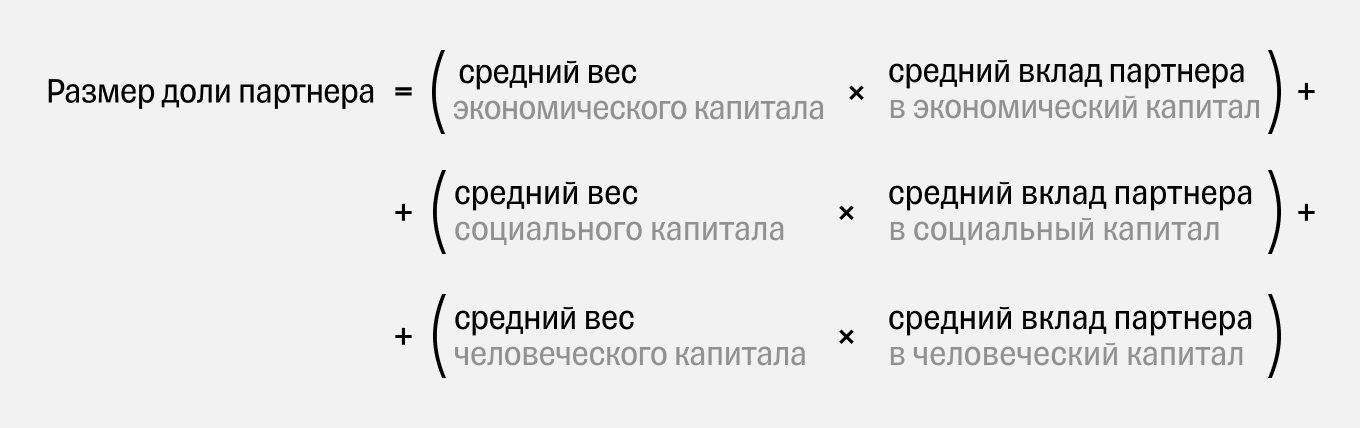 Тогда часть доли такого партнера, которую он получает благодаря своему вкладу в экономический капитал = 0,5 × 25% = 12,5%.