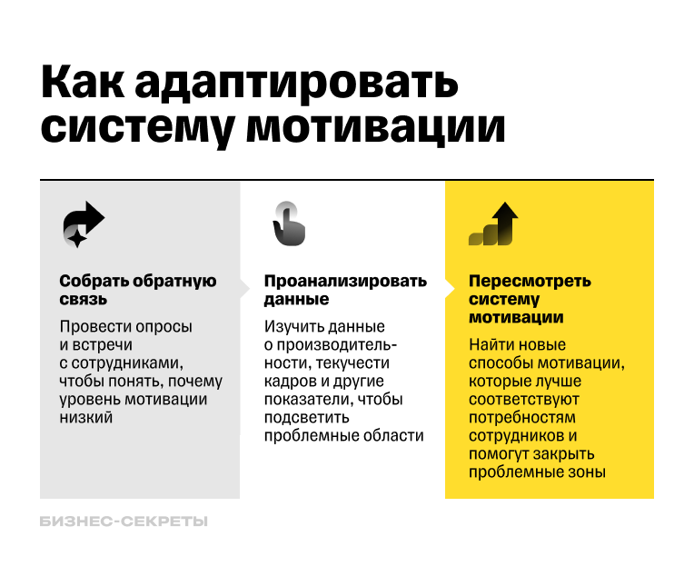 Шаг 5. Внедрить и адаптировать систему мотивации. Когда подготовка закончена, можно составлять план внедрения системы мотивации и реализовывать его. На последнем роль руководителя не заканчивается — наверняка понадобятся доработки. Поэтому важно получать обратную связь от сотрудников и вовремя вносить изменения в систему.