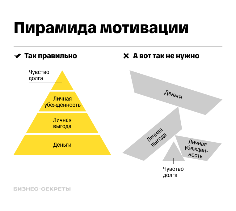 Если посмотреть на мотивацию как на пирамиду, стоять она будет все равно на деньгах. Но помимо денег есть еще три уровня мотивации: личная выгода, личная убежденность и чувство долга.