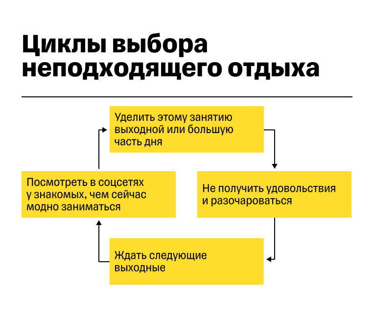 Человек опирается на выбор окружающих, пробует их типы отдыха, уделяет этому занятию значимую часть дня — в итоге не получает удовольствия, не чувствует себя отдохнувшим и ждет новую неделю, чтобы опять повторить цикл, но уже с другим занятием.