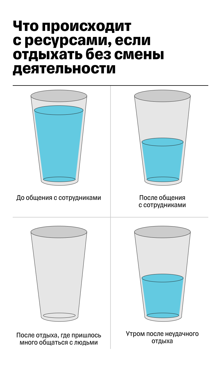 Если не менять деятельность, отдохнуть не получится. Например, если весь день работать за компьютером, а вечером смотреть сериал, скорее всего, полноценно отдохнуть не выйдет. То же произойдет, если провести за день несколько встреч с сотрудниками и вечером встретиться с друзьями.