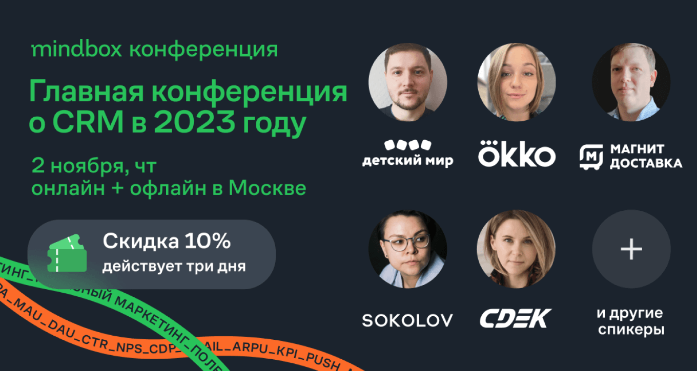О чем речь. В Москве 2 ноября пройдет mindbox конференция «CRM‑маркетинг: гипотезы и кейсы от управленцев». Эксперты ведущих российских компаний расскажут, как выстроить коммуникации с клиентами, чтобы они возвращались за покупками. В числе спикеров — представители KFC, Детского мира, Нетологии, Sokolov, СДЭК, 12 Storeez.