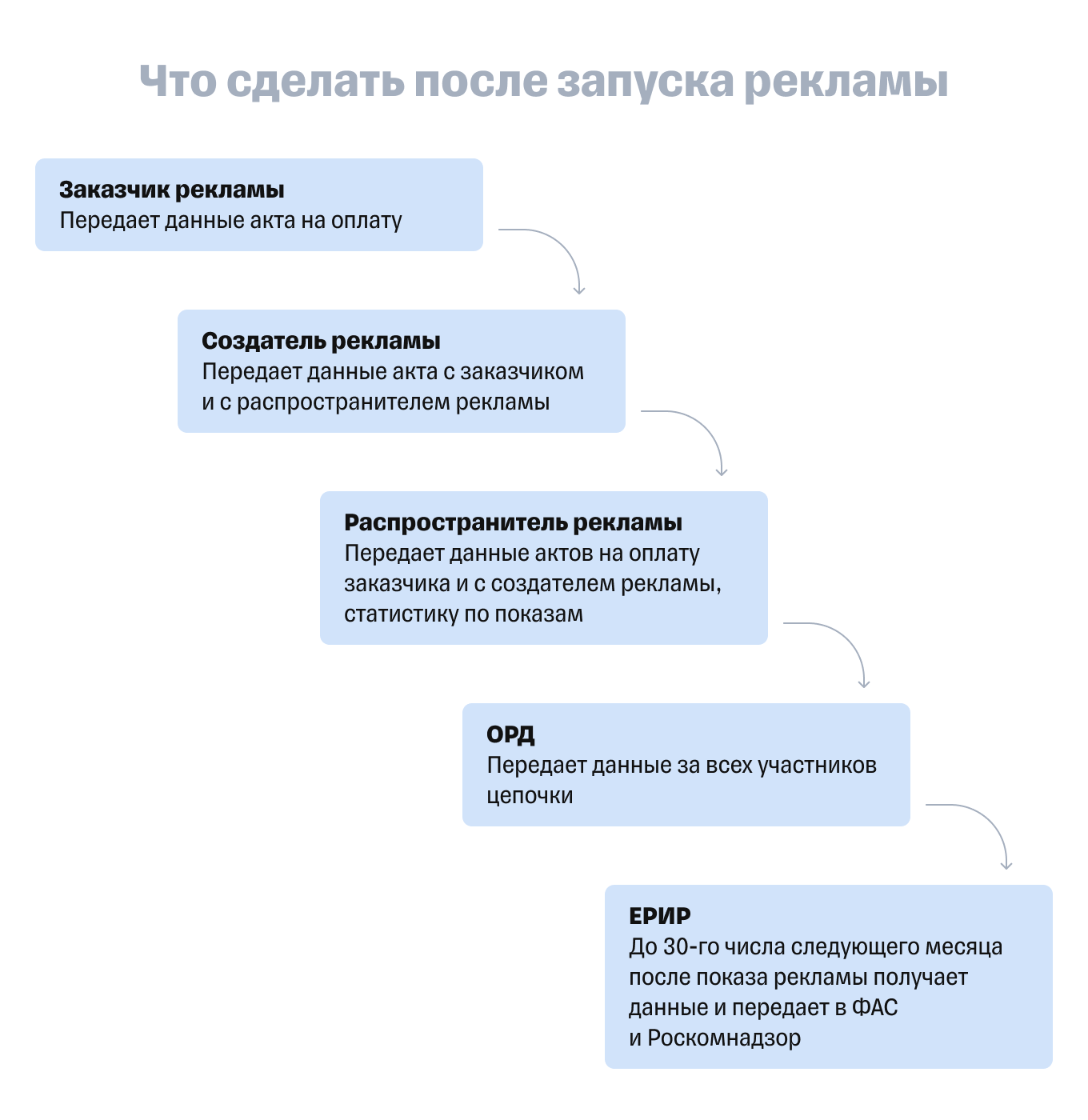 После показа рекламы в интернете надо заполнить данные о договорах и всех участниках цепочки — рекламодателе, рекламном агентстве, площадке размещения — до 30‑го числа следующего месяца. Если рекламу запустили в сентябре, заполнить данные надо до 30 октября.