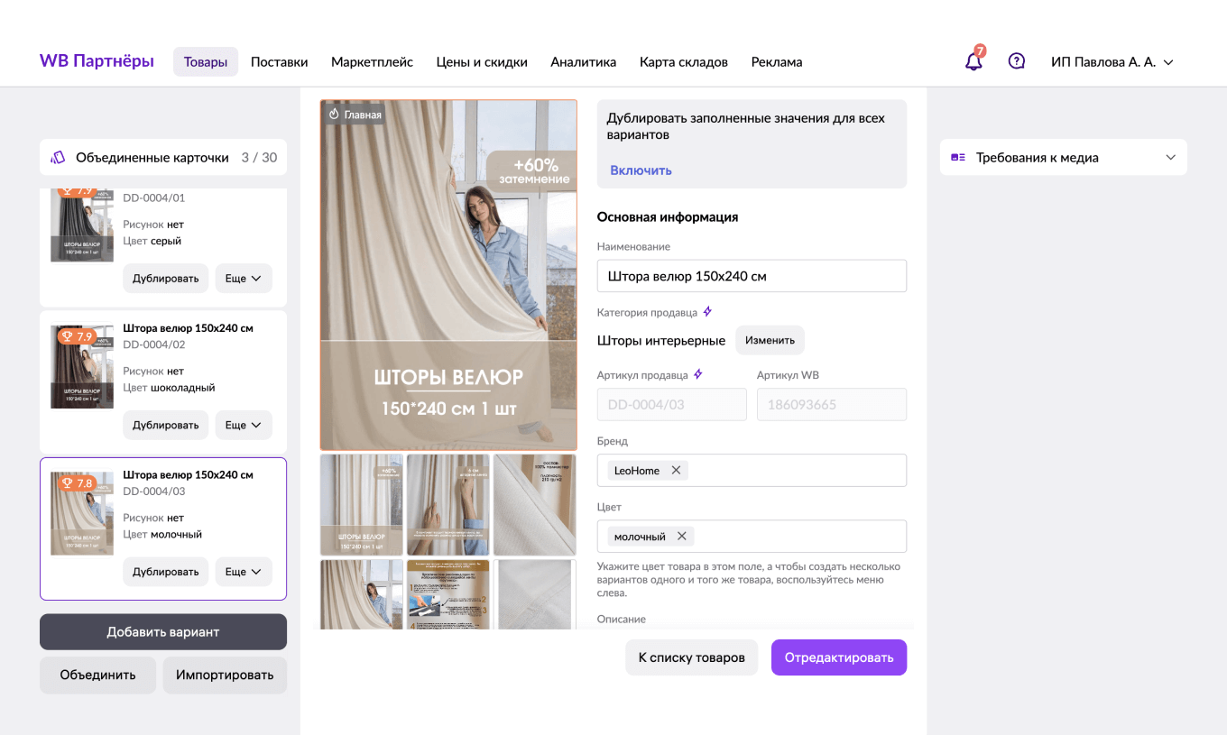 Создавать и редактировать карточки товаров. В них нужно загружать фотографии, видео, делать описание, заполнять характеристики. Готовить контент для карточки менеджер может самостоятельно или с помощью подрядчиков, например дизайнеров, фотографов, копирайтеров.
