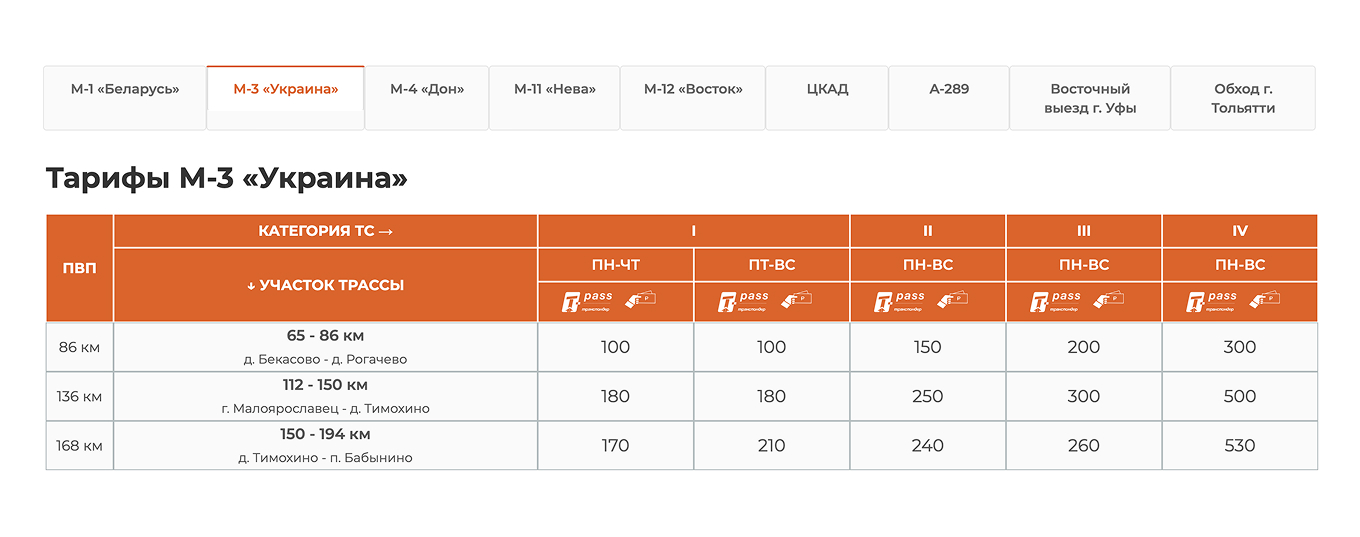 Цены на проезд могут быть фиксированными, а могут зависеть от пройденного расстояния, дня недели, времени суток и способа оплаты. Например, на платном участке трассы М1 «Беларусь» цена фиксированная, а на М11 «Нева» с 15‑го по 58‑й км зависит от способа оплаты, даты и времени поездки.