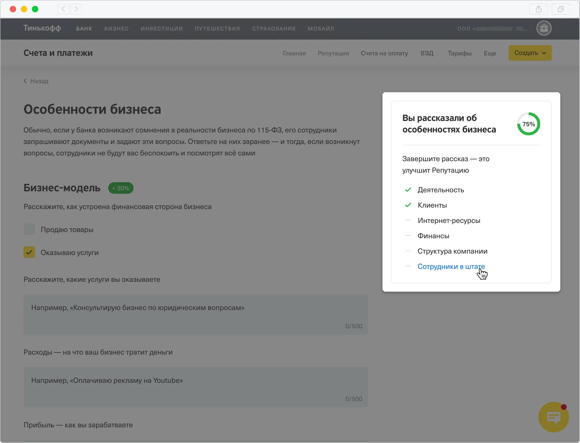 В Т-Банк есть сервис «Репутация», он нужен, чтобы помочь бизнесу увидеть себя глазами банка. Он бесплатный. В нем клиент может ответить на вопросы анкеты и в свободной форме рассказать об особенностях бизнеса.